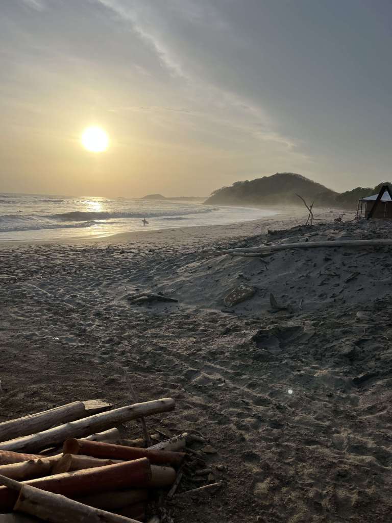 I put on my zinc sunscreen and asked if there was a bathroom. It’s a small bay with a couple surf shacks, I figured there might be one.  I told him I had to shit, he pointed me to a well with an enormous iguana hanging on the side. I  asked another girl who said there aren’t any. As the knot dug deeper in my stomach  I had to rush back home to not shit my pants.